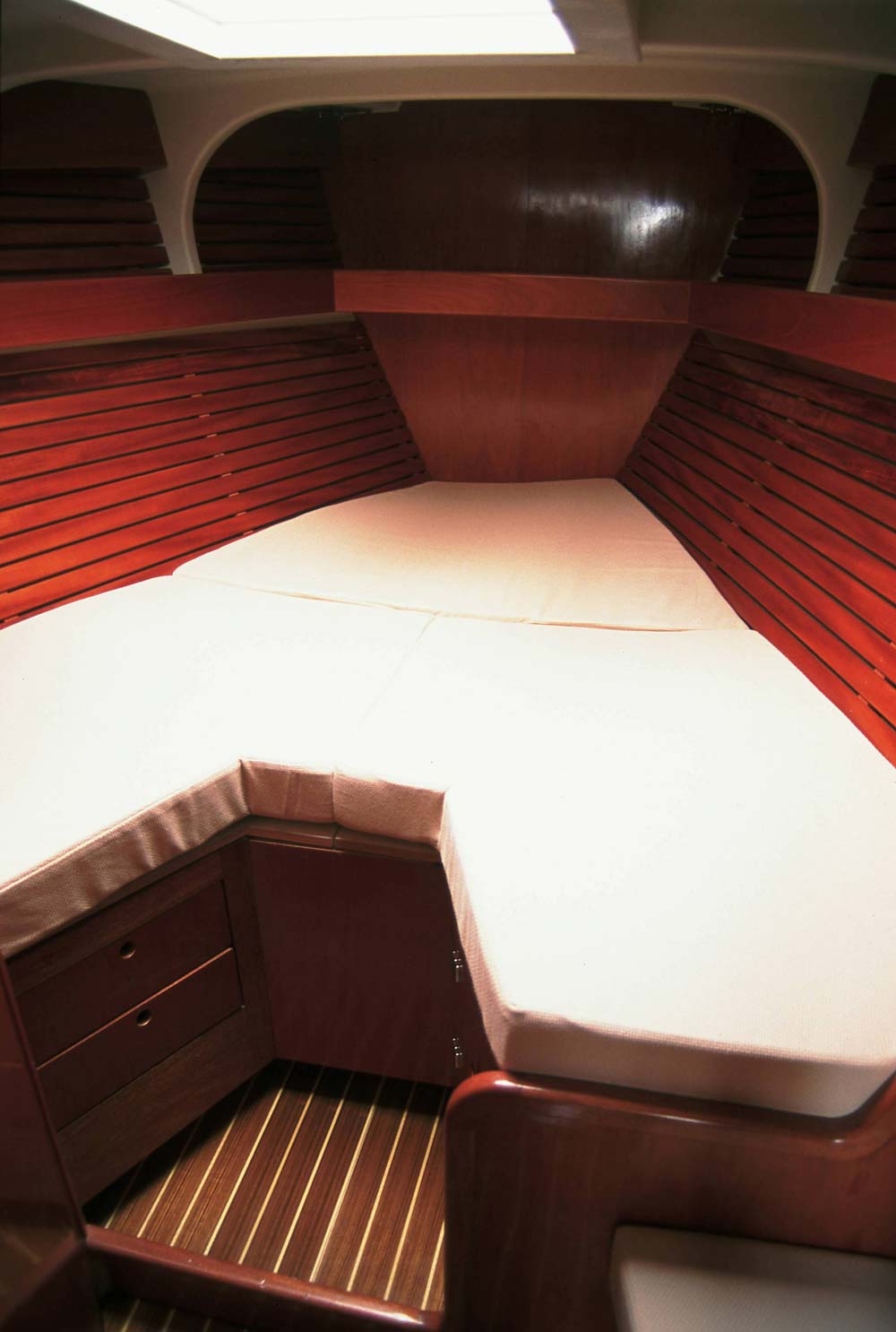 Estructura moderna formada por mamparos longitudinales y transvesales, laminados al casco, ofreciendo una máxima rigidez.